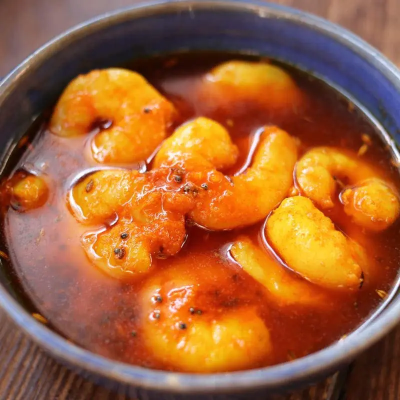 南インドで人気のアチャール。エビのアチャールは南インドでは瓶詰めになってスーパー等に売っている人気の保存食。レモンの爽やかさとスパイスの辛みが重なって一つ食べ始めたら止まらなくなります。ぜひお酒を片手にできたてのエビのアチャールをお楽しみください。