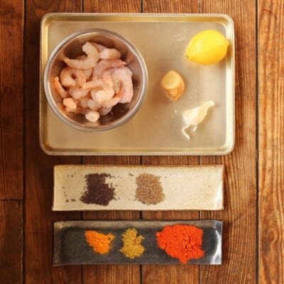 ボウルに移した海老にレモン汁、ターメリック以外のスパイスB、塩を加えて混ぜ合わせる。(ココナッツファイン大さじ1も加えると美味しい) |