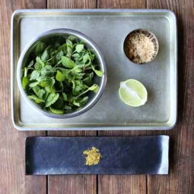 ミントは洗っておき、ライムをざく切りにします。ミント、ライム、粗製糖を混ぜて潰しておきます。 |