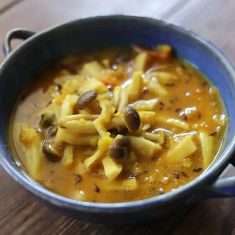 南インドでは毎日、毎食でてくるようなカレー、サンバル。豆と野菜を煮込んだスープです。日本で言うとみそ汁的な存在ですかね。タマリンドや梅干しで少し酸味を加えることでさっぱりと食べることができます。今回はアレンジを加えて秋の味覚、キノコが沢山食べられるレシピです。