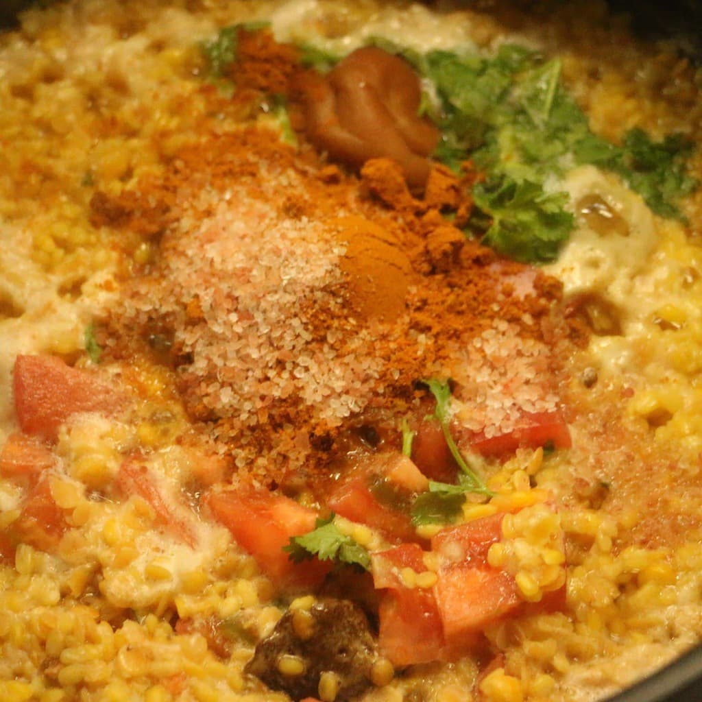 鍋につけておいた豆を入れトマト、パクチー、スパイスB、塩、黒糖、梅干し、水を加え、中火で煮込む。 |