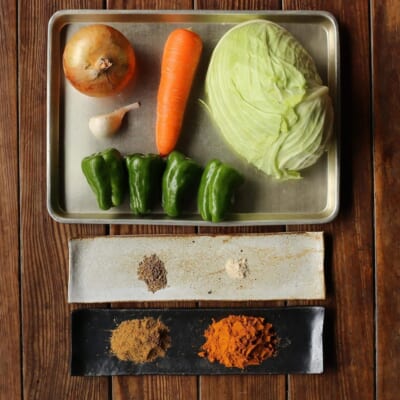 人参、ピーマン、キャベツを炒める。 軽く火が通ったら水を加えて混ぜ、スパイスBを加える。 |