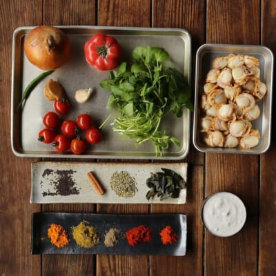 ※ホタテの貝ひもも剥がして、軽く刻んでおく 温めたフライパンに油をいれスパイスA(マスタード、シナモン、フェンネル)を加える。 |
