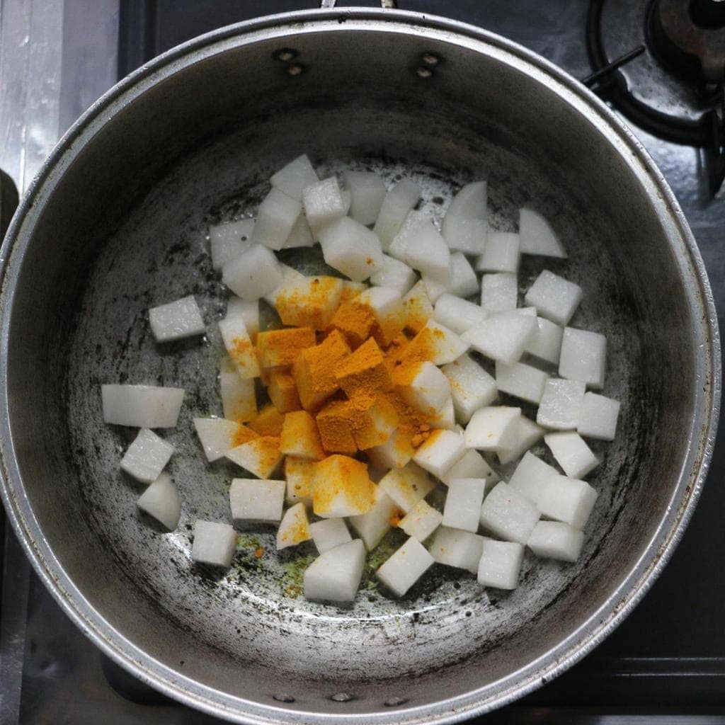 ※さいの目に切った大根を塩もみしておく。水分が出るまで放っておきます。 フライパンにサラダ油を引き、マスタードシードを香りが立つまで炒める。