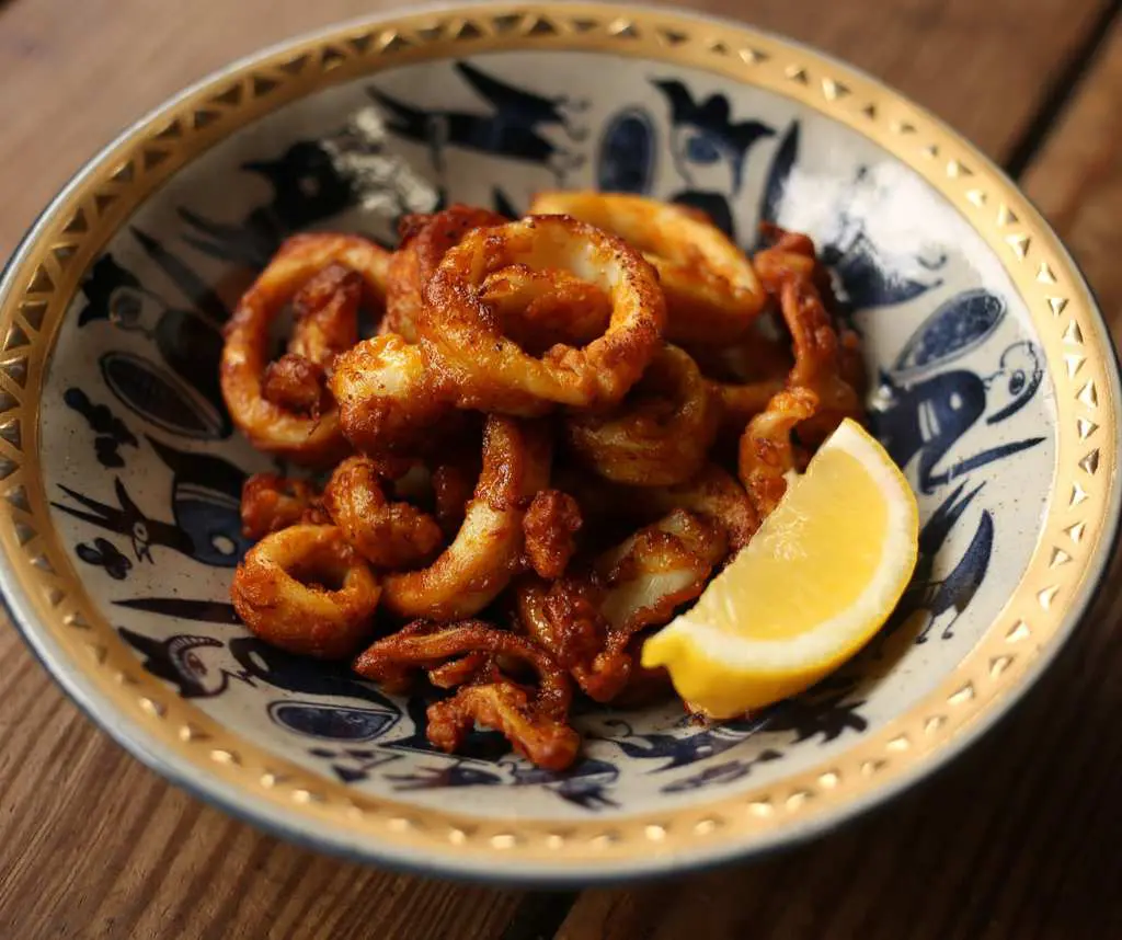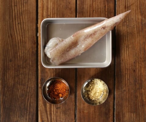 ※イカの内臓をとり皮を剥ぎ、1センチ幅の輪切りにして水気をキッチンペーパーなどでとっておく。 ボウルにベッサン、カレー粉、塩、水を加えよく混ぜ、イカを加えます。 |