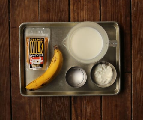 バナナ(ミキサーにかけやすい大きさに切る)、ヨーグルト、牛乳、砂糖、ゴールデンミルクを滑らかになるまでミキサーにかけます。これだけで完成です!