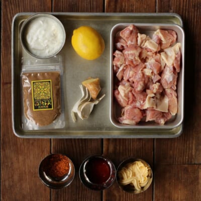 鶏肉、ヨーグルト、にんにく、ショウガ、レモン汁、スパイスAのスペシャルガラムマサラ、塩を混ぜ、30分ほどつけておく。 |