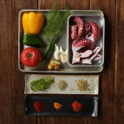 今回のカレーは南インドのカレーの作り方です。食材がタコということで、エッセンスとしてはスペインのガリシアやシシリアをイメージし、パプリカやフェンネルを入れてます。パプリカと一緒にピーマンもあれば、ビタミンカラーが美しいカレーに。