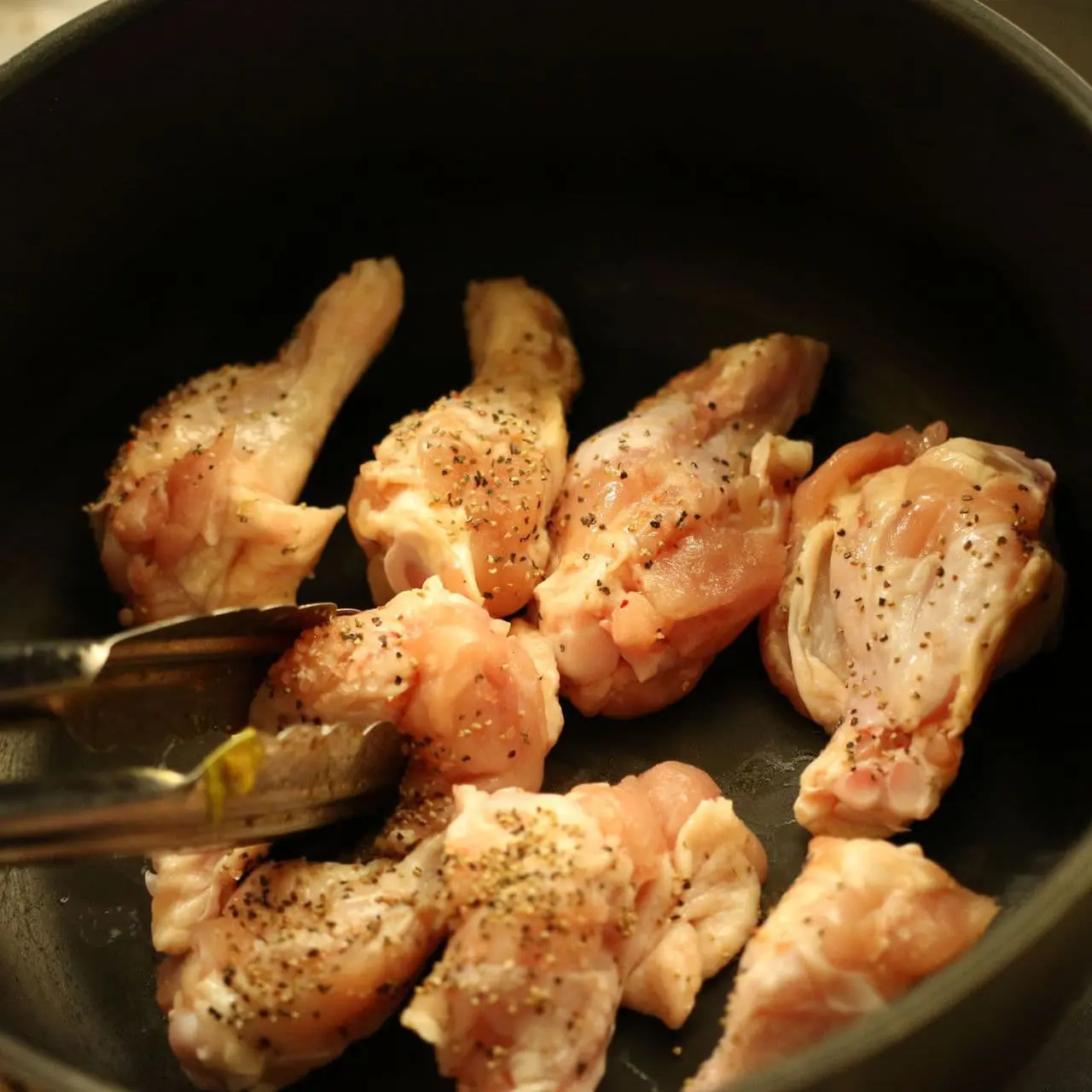 ※野菜の皮は出汁に使うので取っておく。 手羽元に塩、胡椒(分量外)をまぶし、油をひかずに表面が色づくまで焼く。 |