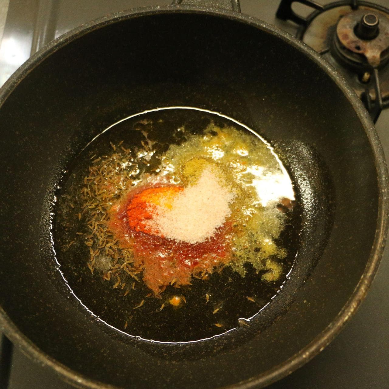 軽く温めた油に、全てのスパイス、塩を入れます。 |