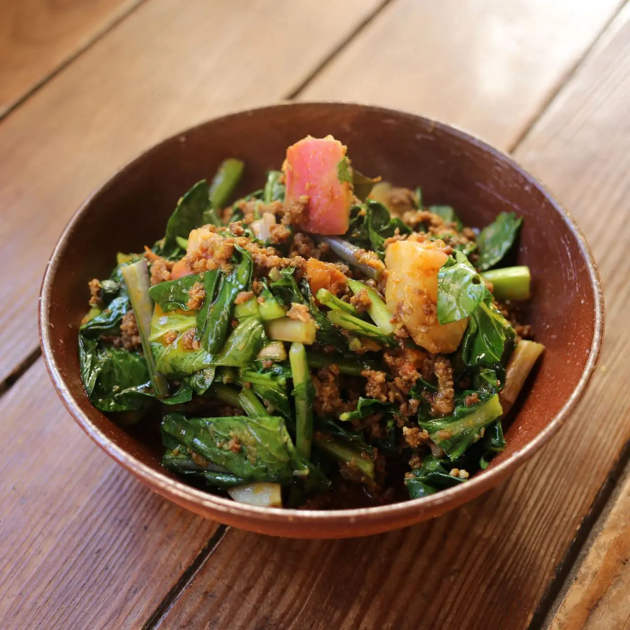 かぶの食感と、青菜のシャキシャキ感を生かしたかぶと青菜のキーマカレー。青菜は葉野菜であればなんでも合うので、ほうれん草や小松菜、菜の花、カラシナなどお好みに合わせてお使いください。もしもかぶが葉っぱ付きであれば、かぶの葉も一緒に入れていただくとなお良いです。