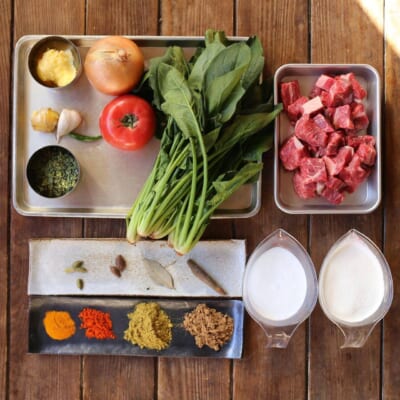 牛肉が入った鍋にほうれん草のペーストを加えて混ぜ、最後にカスーリメティパウダーを加え一煮立ちさせたら完成。 |
