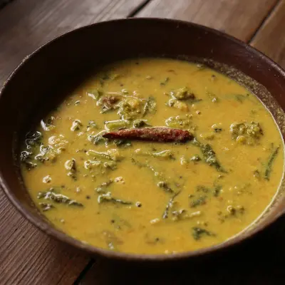 刻んだ菜の花を入れて火が通ったら、ミント、カレーリーフを入れる。 |
