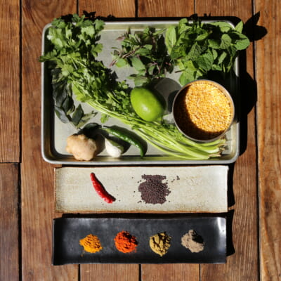 カレーリーフ、ペパーミント、ペーストにしたハーブをムングダールの鍋に入れる。 |