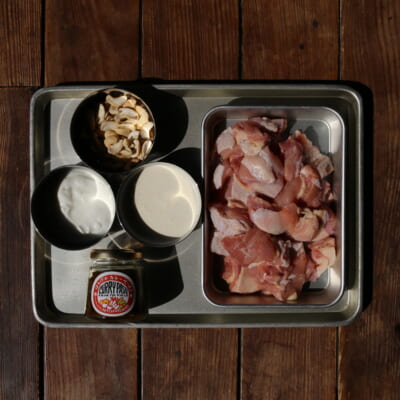 一口大に切った鶏肉にはたけのカレーペーストを1瓶ごとヨーグルトと一緒にマリネする。 |