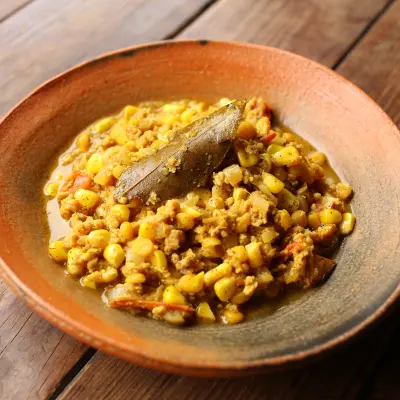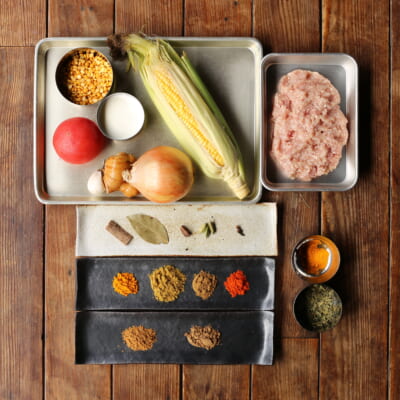 トウモロコシの黄色とチャナダールの黄色が鮮やかで美味しい。ガラムマサラの深みと煎ったカスーリメティの甘く香ばしい香りがチャートマサラの爽やかな酸味と重なり、一口一口が美味しく感じるレシピになったと思います。ひき肉、豆、コーンの食感も異なるので食べていて楽しいカレーです。