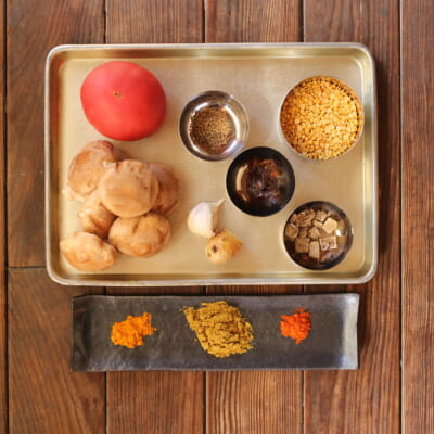豆のとろみ、椎茸の旨味、スパイスの香りに黒糖の甘みを加えて考えたレシピです。西インドの田舎で食べていたような味に椎茸の出汁を加えて、優しい味に仕上げました。スパイスを増やすことでより辛くできたり、香りを複雑にもできますが簡単に、気軽に作ってもらいたいので基本のスパイスで作れるようなレシピになっています。レシピ中のタマリンドは梅干し1,2個で代用しても構いません。
