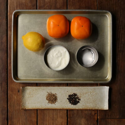 甘いヨーグルトソースに大人なスパイスを加えた美味しい一品です。柿の代わりに季節の果物でもお楽しみください。