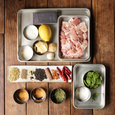 ヨーグルトに⒉のローストスパイス大さじ3、スパイスB 、塩、溶かしバター(大さじ2)、レモン汁、おろしにんにく・生姜を鶏肉にマリネしておく。できれば2時間程度から一晩つけておく。