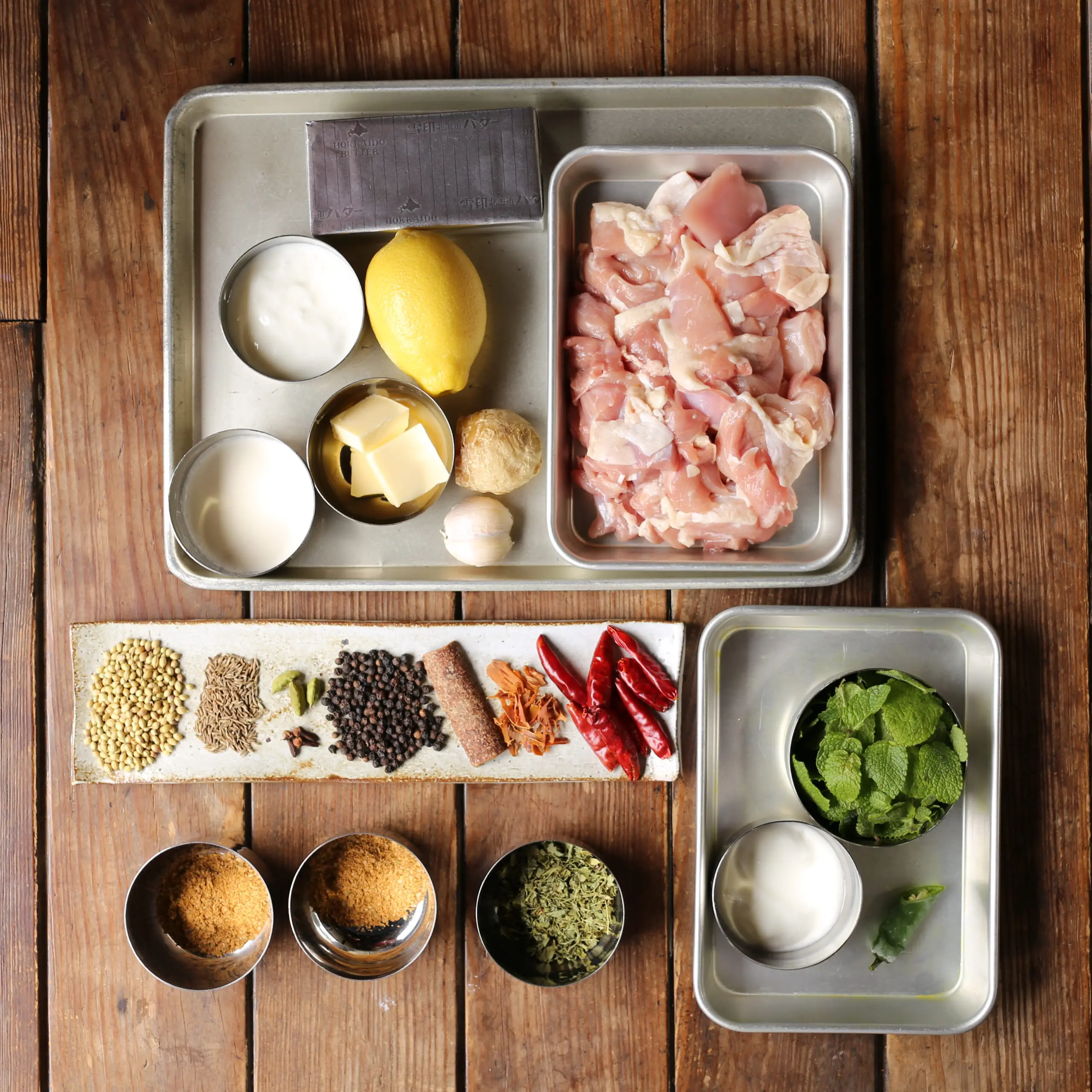 焼けたチキンに生クリーム、ミントチャツネを絡ませてる