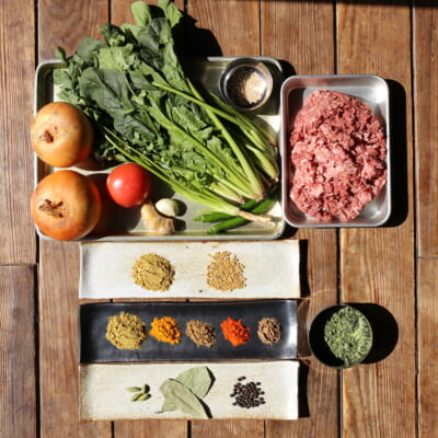 南インドはタミルナドゥ州にある避暑地「ニルギリ」。青い山脈という意味を持つこの土地は紅茶「ニルギリ」の産地でもあり、すっきりとした味わいのニルギリはストレートやレモンティにして飲むと美味しい。そんな緑豊かなニルギリはほうれん草も有名である。ニルギリの山々を表したような深い緑のキーマカレーはニルギリらしく、奥深い味がする。ぜひ作ってみてください。