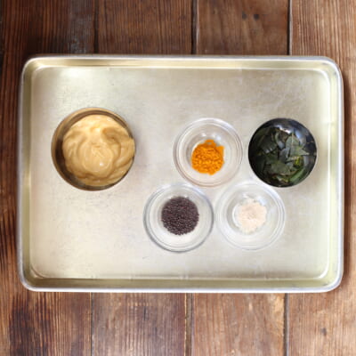 フライパンで油を熱し、マスタードシード、カレーリーフ 、ヒングの香りを移す。 |