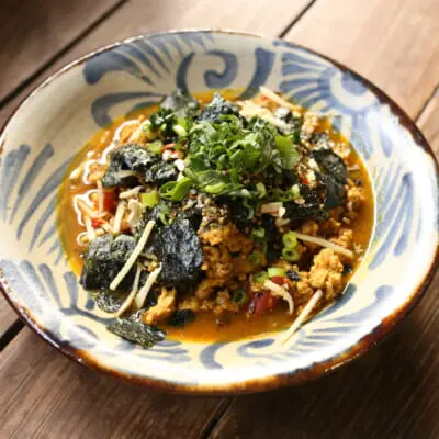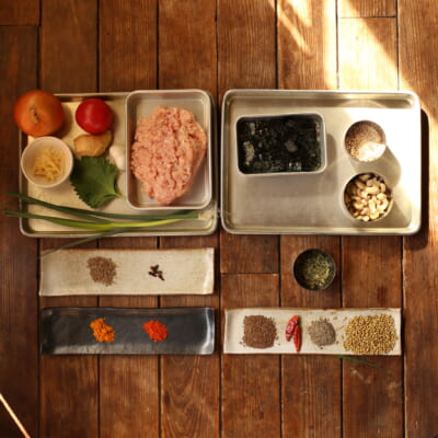 海苔を使ったカレー。海苔の香ばしさをナッツやカスーリメティ 、ゴマや爽やかな香りのスパイスで引き立てたさっぱり食べれるけどどこか深みがあるキーマカレー。ローストしたスパイスや海苔がアクセントになっています。水で少し伸ばしても、カツオ出汁で伸ばしても美味しくお茶漬けのように食べても良いかもしれません。