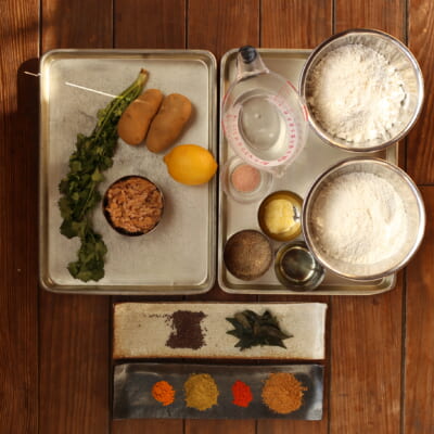 ツナを加え炒め、さらにマッシュしたじゃがいもを加えスパイスB、塩、パクチーを入れ、仕上げにレモン汁を加える。 |