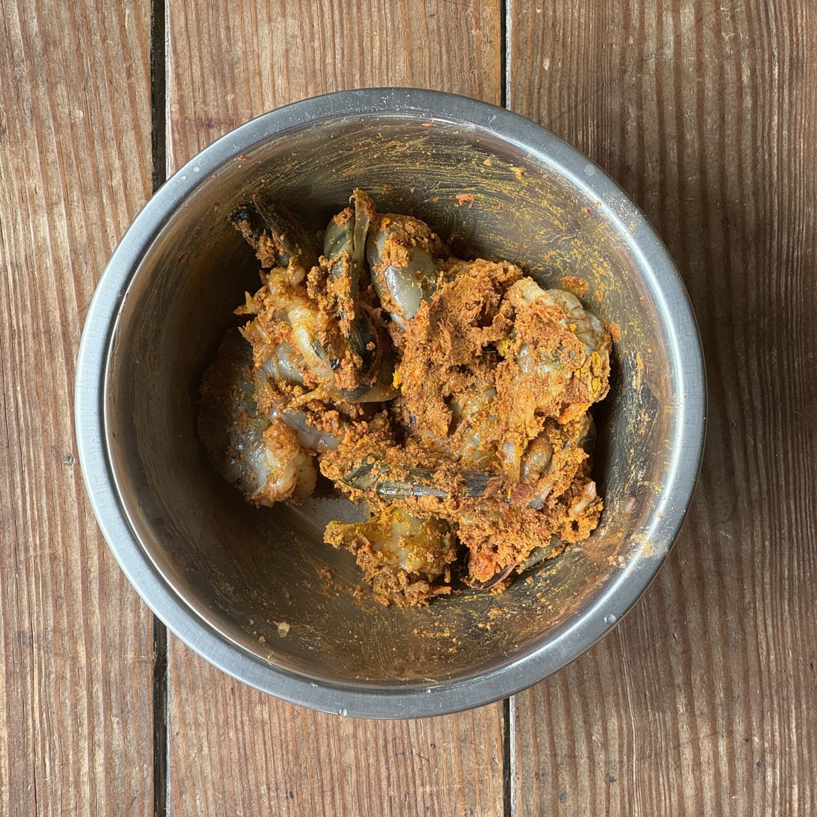 海老の殻を剥き背わたをとりスパイスBと塩、レモン汁、すりおろしにんにく・生姜でマリネしておく。 |