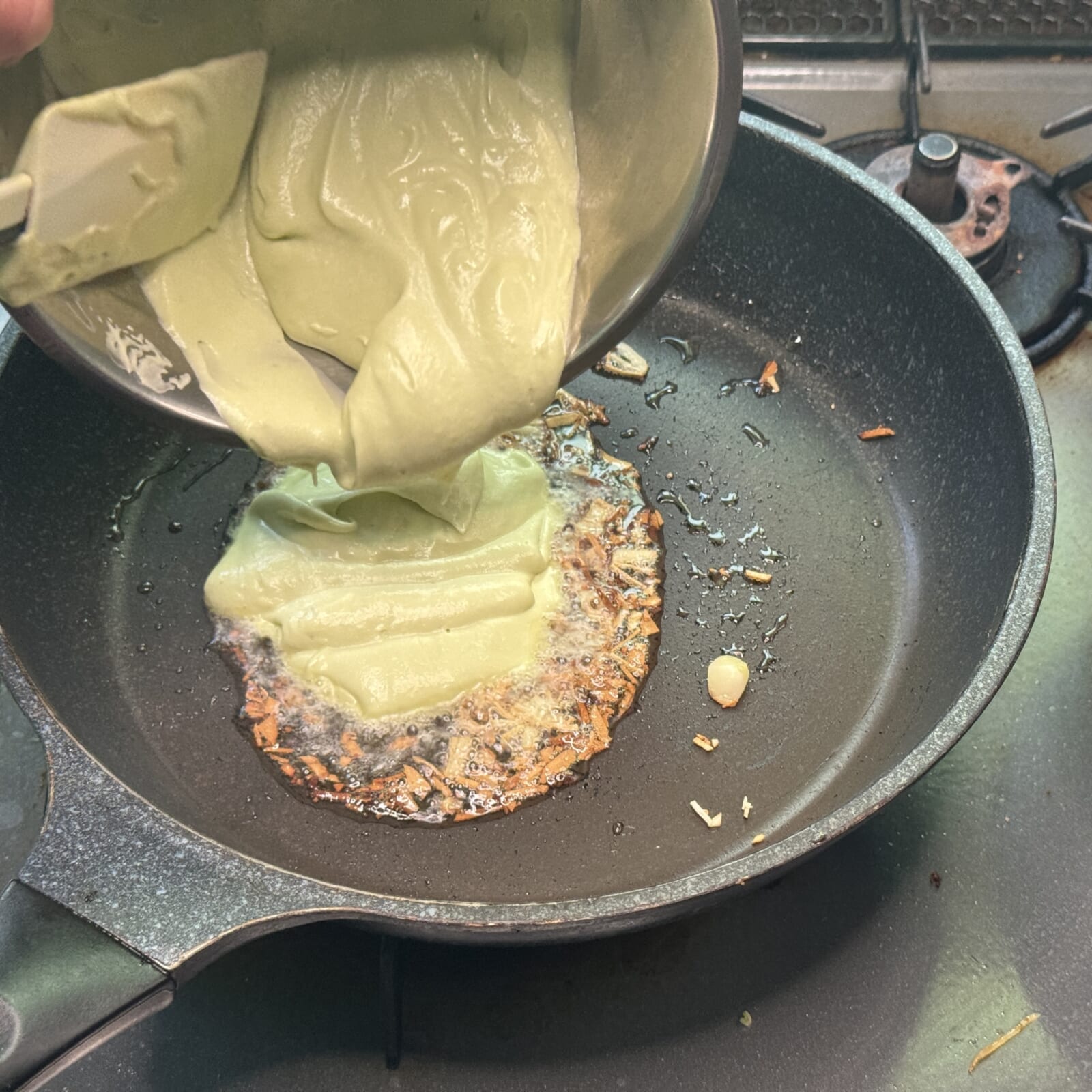 別のフライパンに油を熱しタイム、みじん切りにしたにんにくを熱しアボカドクリームを加える。 |