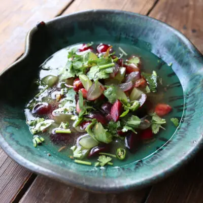 水で伸ばしていき、ミント、青唐辛子、パクチー、ブドウ、チェリー、マスカットを加えて混ぜ合わせる。