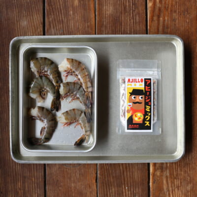 オリーブオイルに海老、スパイスを加えじっくりと熱する。 |