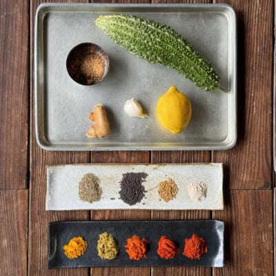 火を止めおろしにんにく、生姜を加え軽く火を通し、スパイスB、塩、黒糖を加えゴーヤを加え一緒に炒める。 |