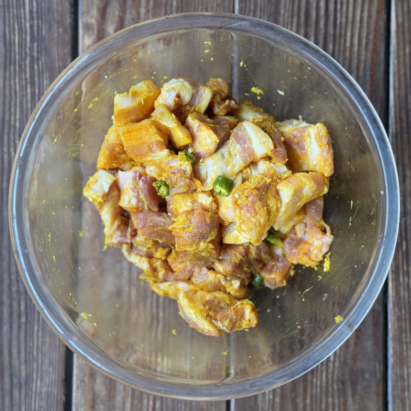 カットした豚肉をおろしニンニク、生姜、塩、スパイスA、青唐辛子でマリネしておく。