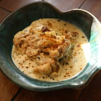 そんな新しいタイプのバターチキンが美味しかったのでちょっと作り方や見た目を変え、アスラムバターチキンに寄せて全く違うレシピを作って見ました。その名も「ホワイトバターチキン」