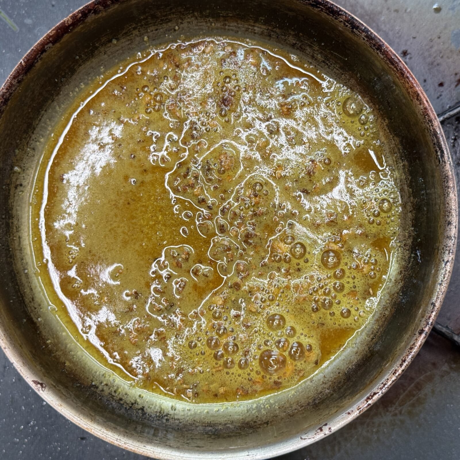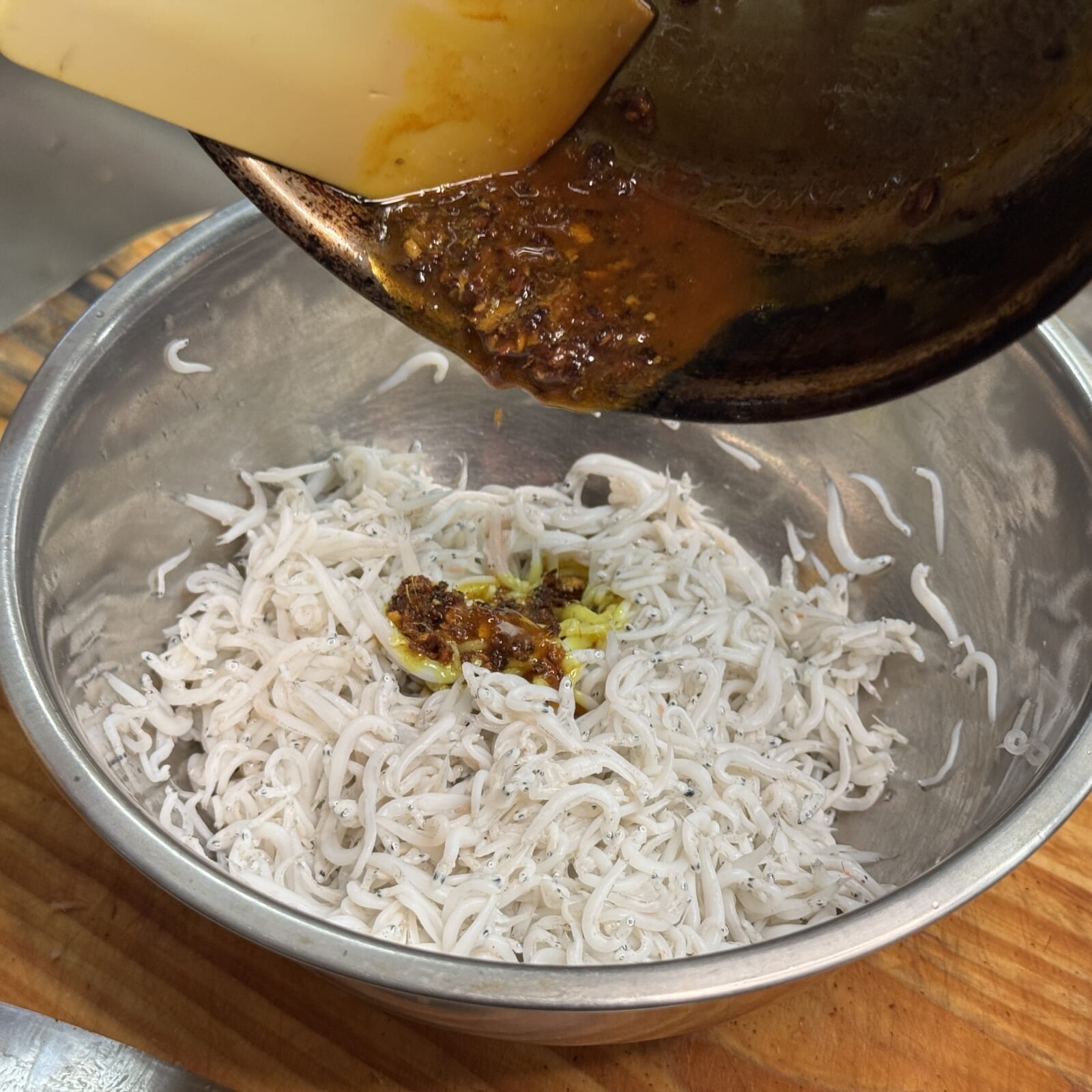 火を止め油の温度が下がったら⒈のボウルに油ごと加え混ぜ合わせる。 |