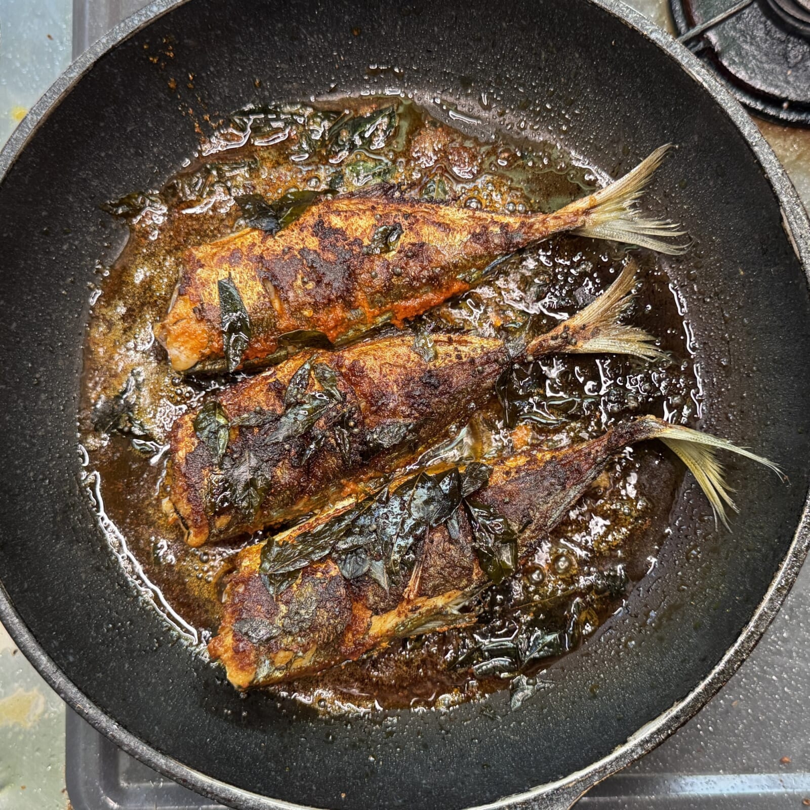 温めたフライパンに油を熱しスパイスAを加えパチパチしてきたら⒉の魚をマリネ液ごと焼いく。 少し焦げ目がつくくらいしっかりと焼いたら裏返して、両面焼いておく。