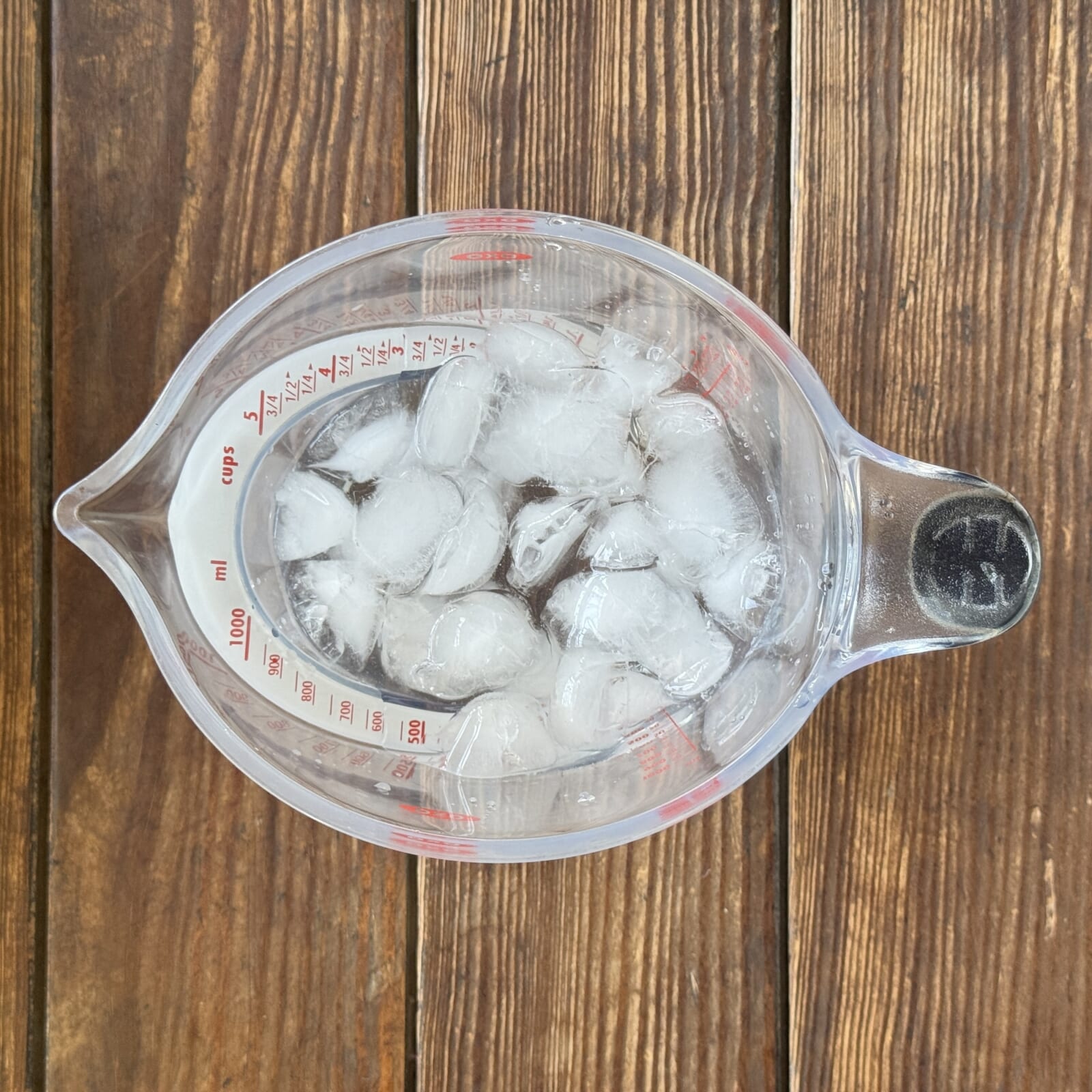 用意しておいた水2カップに氷を入れて冷やしておく。 |