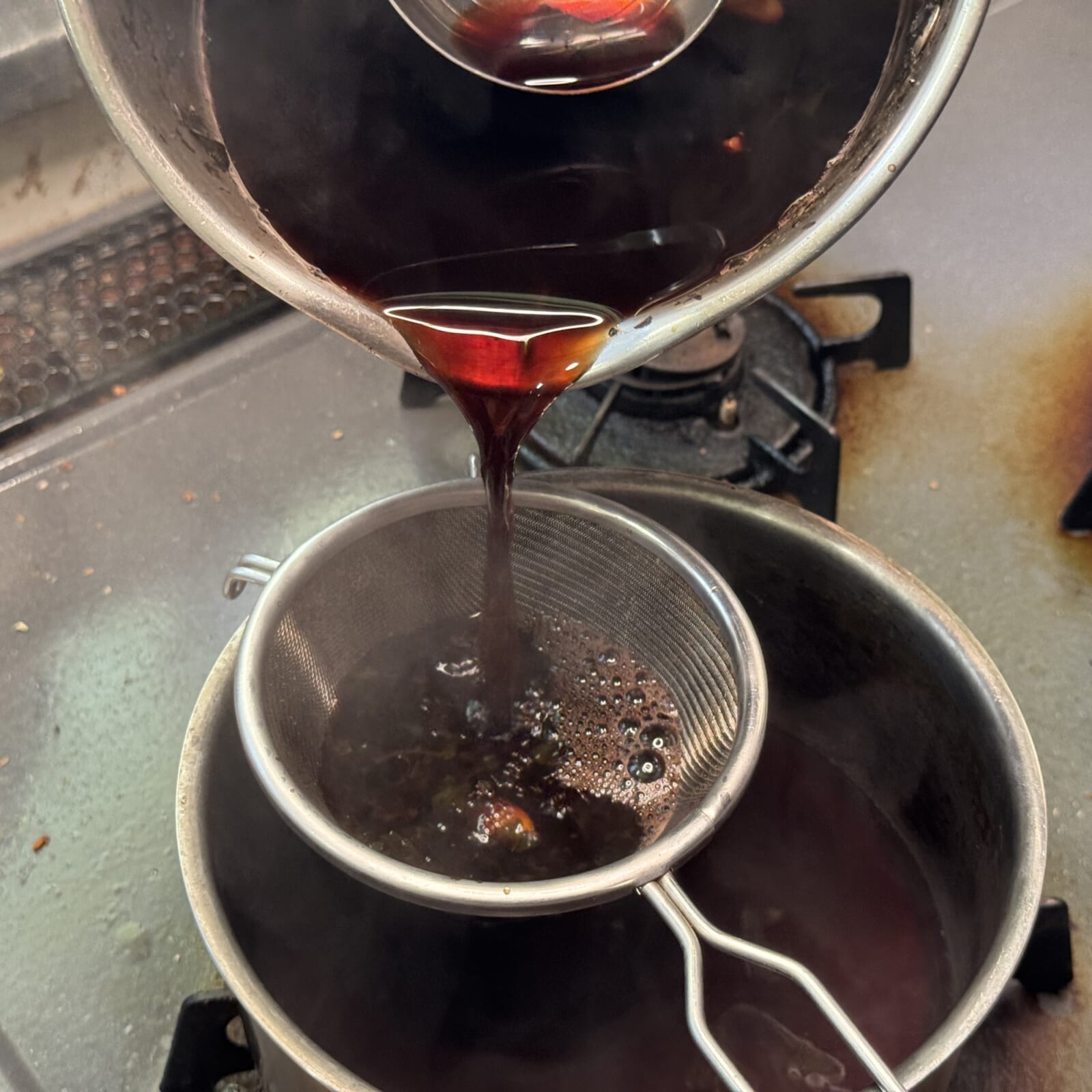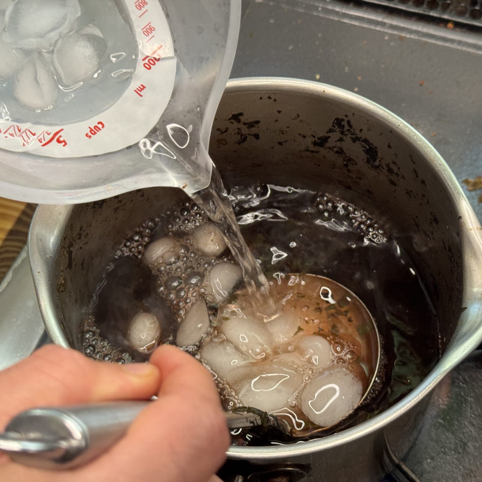 水分量が半分以下になったら用意しておいた氷水を加えさらに沸騰させ、よくかき混ぜる。 |