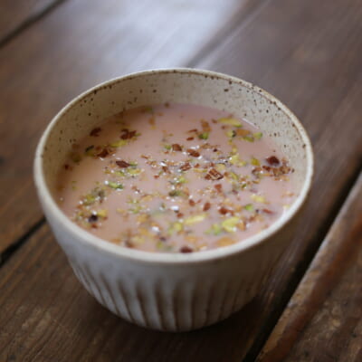 インド北部カシミールやパキスタンなどでよく飲まれるピンク色のチャイ「ヌーンチャイ」や「グラビチャイ」などとも呼ばれている。緑茶と重曹、塩を使うことでピンク色に変化させる。作った原液は約1週間から2週間保存ができるので、ぜひ桜のシーズンなどに作ってお楽しみください。