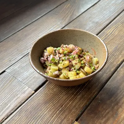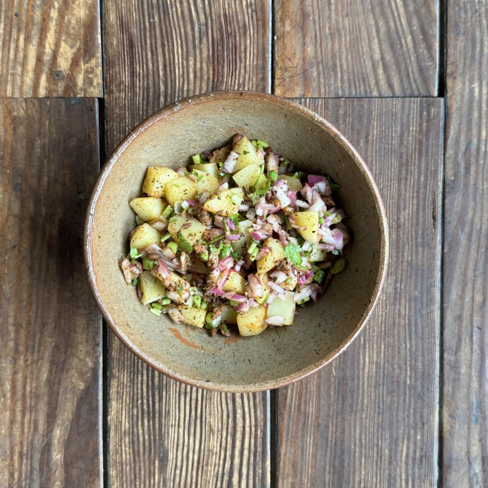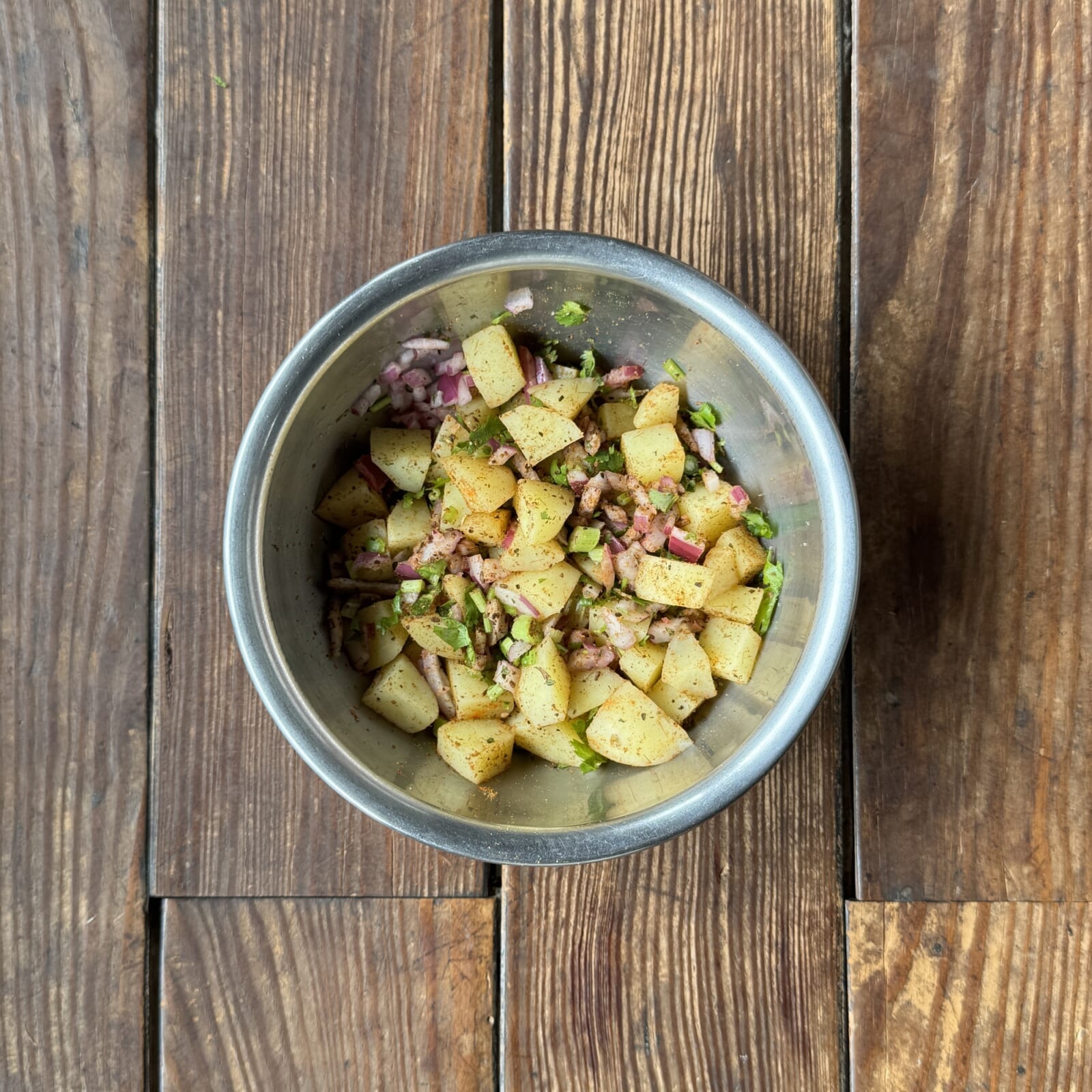 茹でたジャガイモ、スパイスA、スパイスB、パクチー、ブラックソルトを和え玉ねぎを混ぜ合わせる。 |