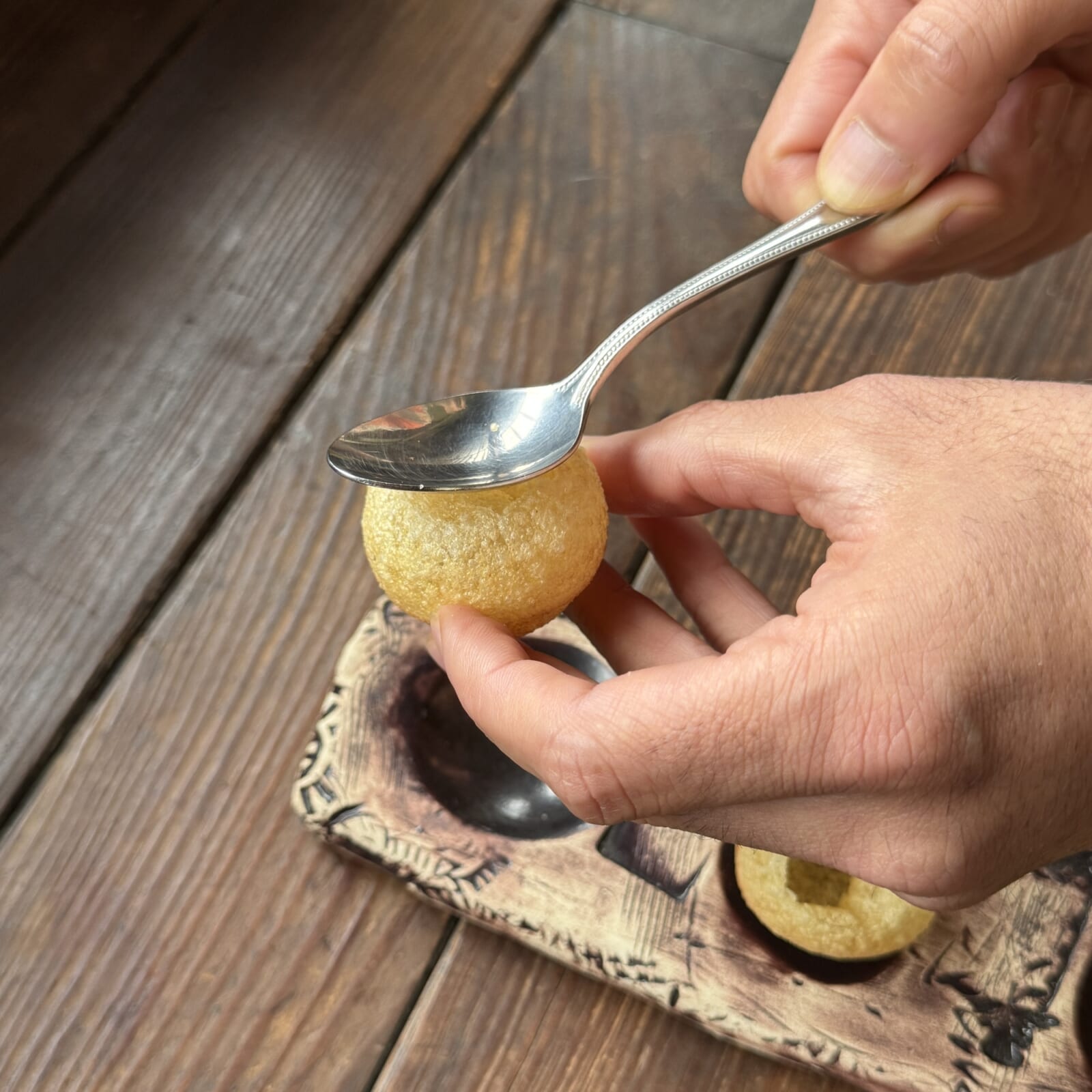 パニプリパパドの頭を叩いて割ってパニプリスタッフィング、パニプリソースなどを入れ一口で食べる。 |