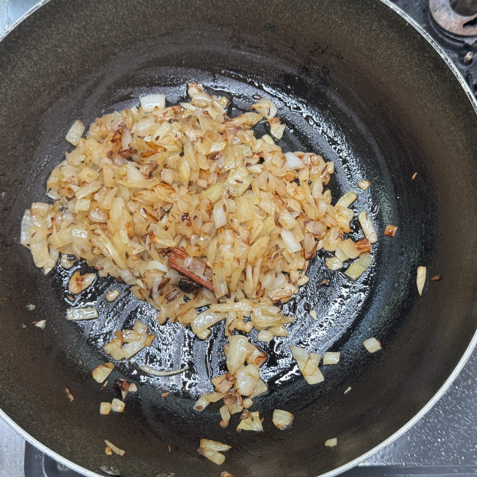 温めたフライパンに油を熱しスパイスAを加え香りが立ってきたら玉ねぎを飴色になるまで炒める。 |