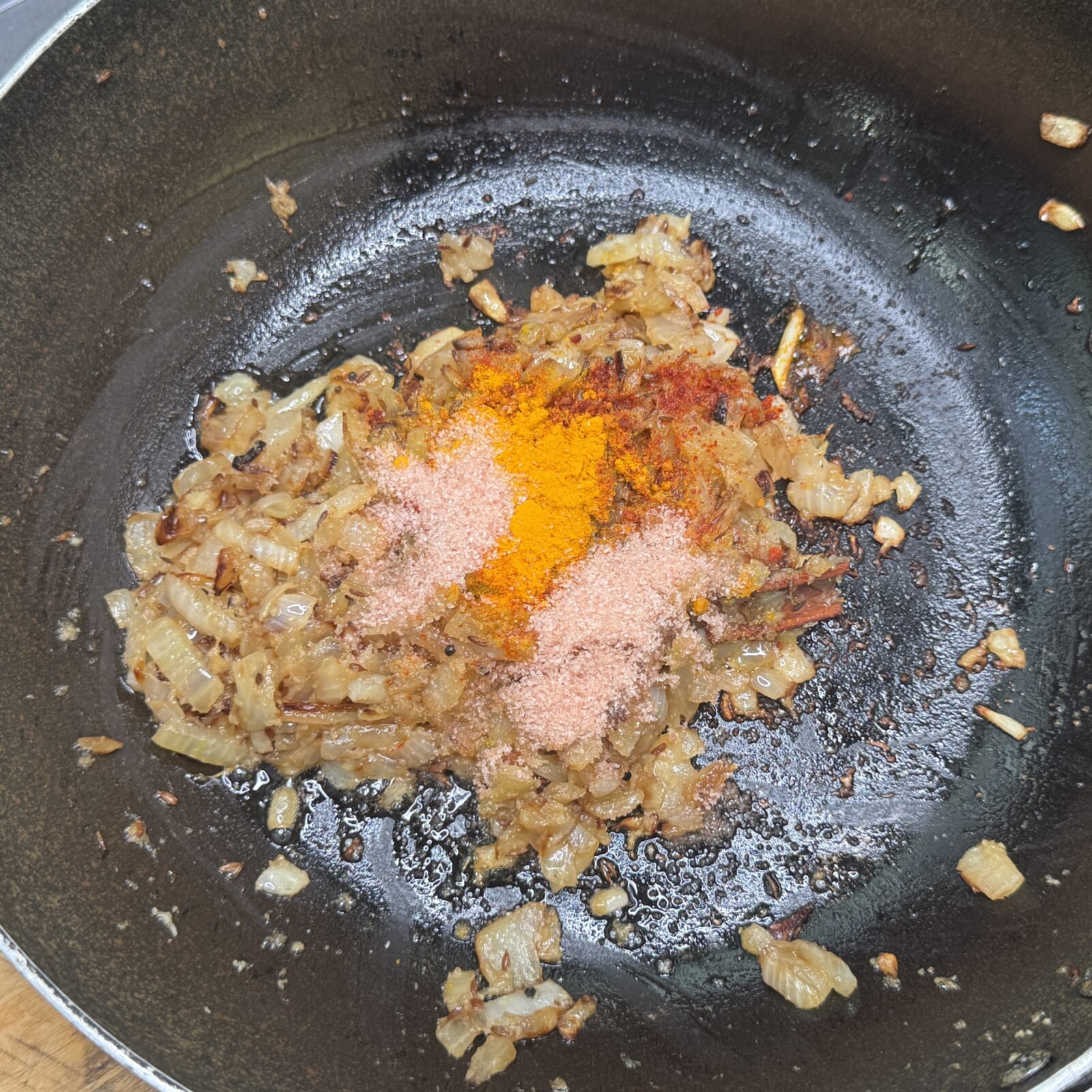 おろしニンニク・生姜を加え炒め合わせスパイスBと塩を加えて炒める。 |
