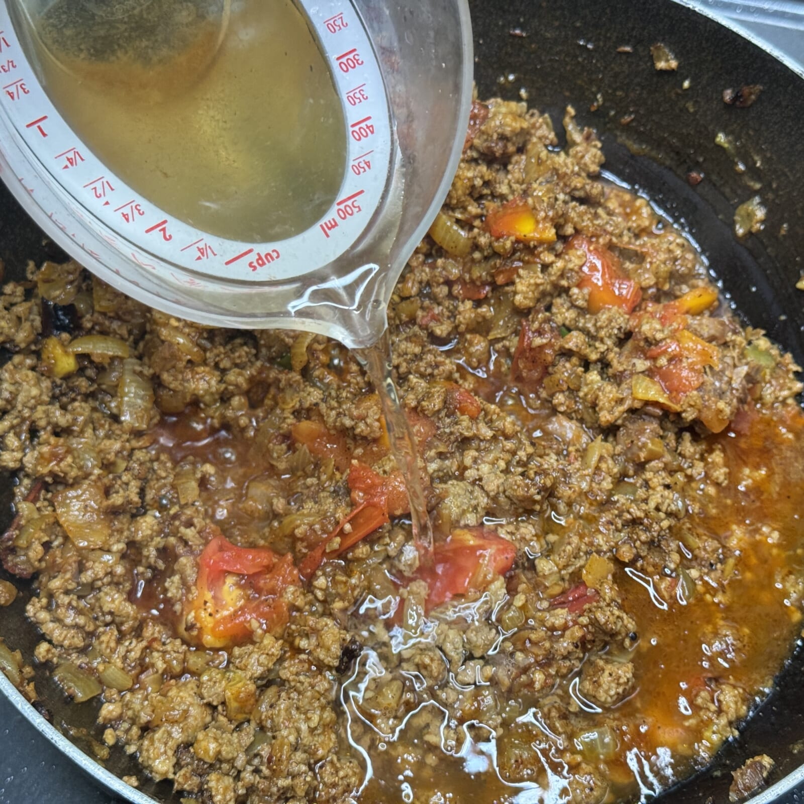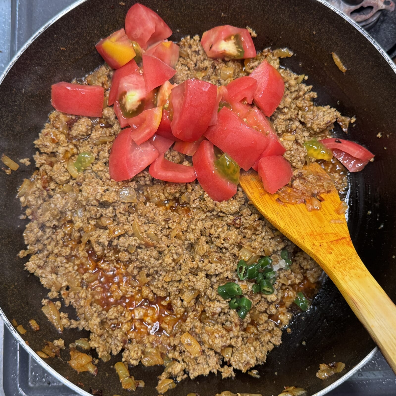 合挽肉を火が通るまで炒めたらトマト、青唐辛子を加えなじませる。 |