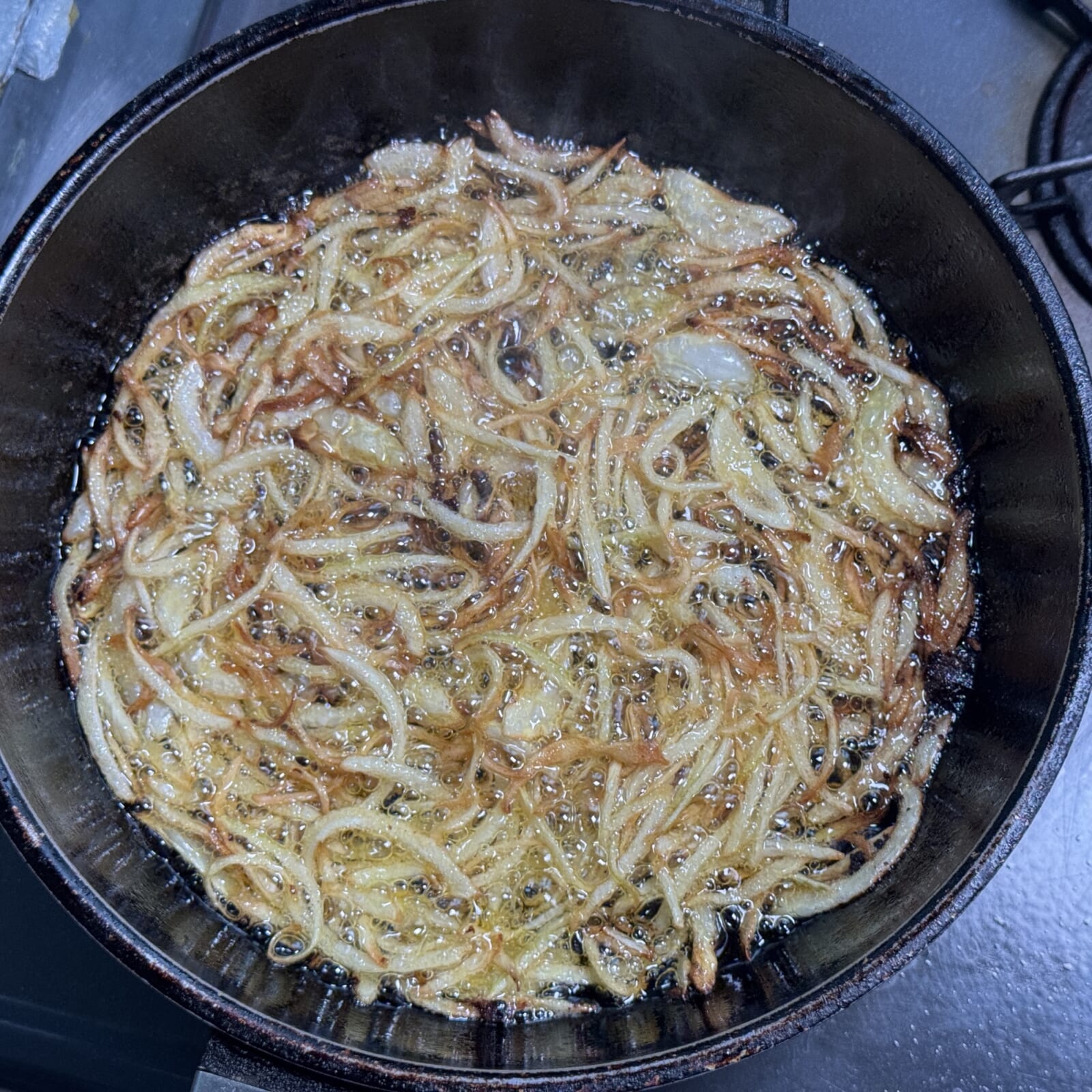 マリネしておいた鶏肉をマリネ液ごと鍋に敷き詰める。その上に ざるにあけた茹でたバスマティライスを被せるようにのせていく。 さらに揚げ玉ねぎ、パクチー、ミントを上にのせ蓋をして強火で5分火にかける。 |