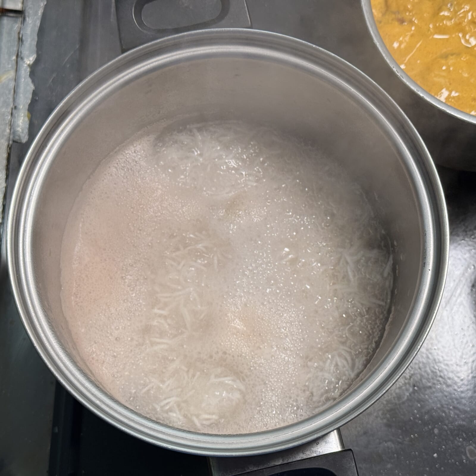 鍋に米を茹でる用の材料、スパイスAを全て入れ沸騰させておく。 バスマティライスを沸騰している鍋に入れ約5分から7分茹でる。(お米に少し芯が残るくらい) |