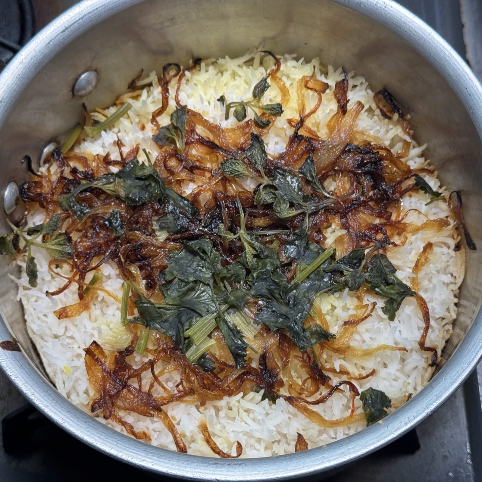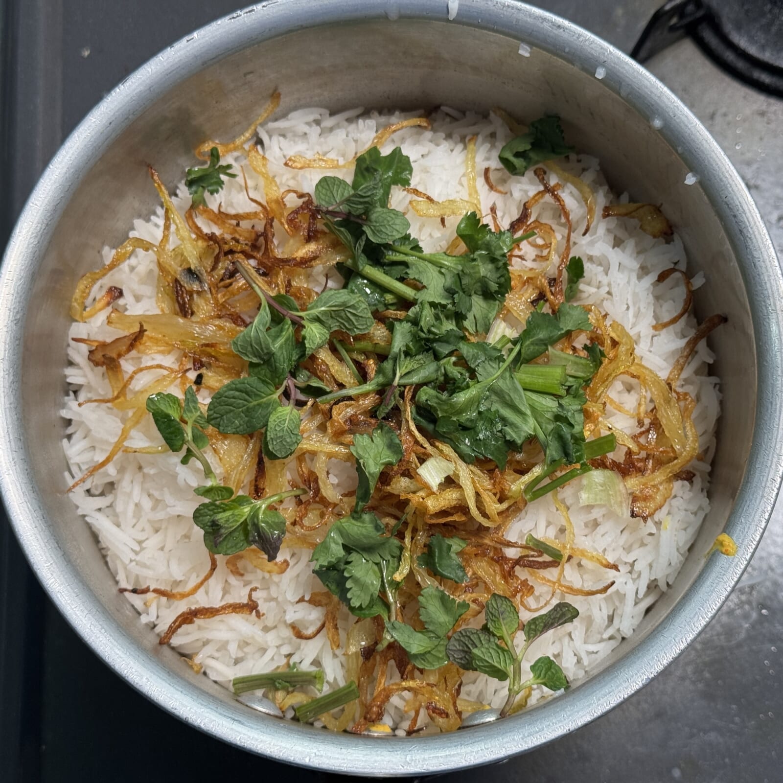 少し珍しい白いビリヤニ。色がつくようなパウダースパイスをあまり使わずに、ハーブで香り…