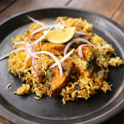 魚を使ったビリヤニも南インドを中心によく食されます。なので今回はカレーリーフやココナッツファインを使って南インド風のテイストに仕上げています。 魚をマリネした時の下味、グレイビーを作った時の味、お米を茹でる時の塩分加減をしっかりとすることでそれぞれを重ねて炊き上げた時に美味しいビリヤニができま